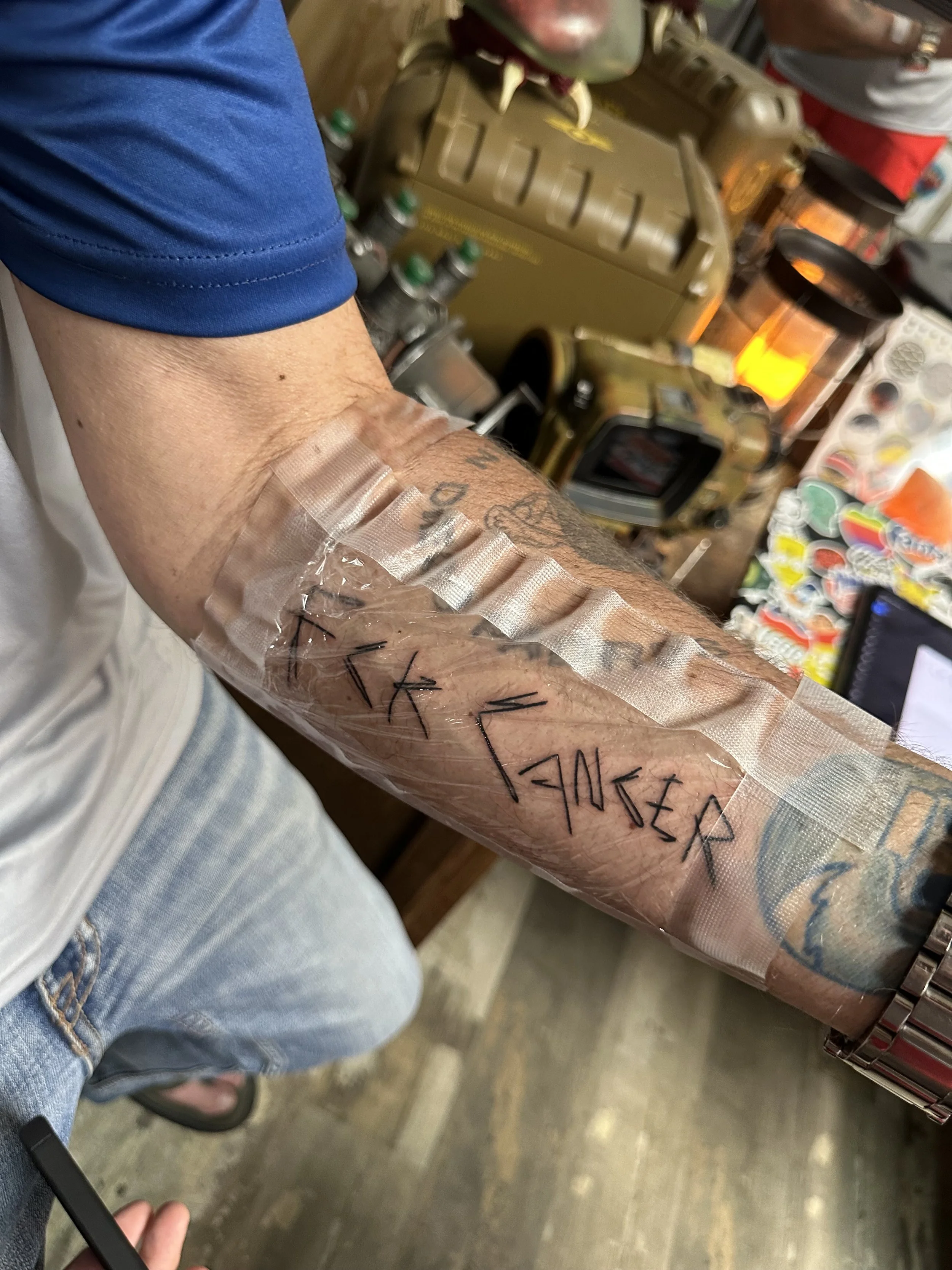 In 2023, Sean was diagnosed with colon cancer, which tragically spread to his liver and lungs. However, he never lost his spirit. After helping his team secure their first championship ring in Austin, Texas, we found ourselves in a tattoo shop waiting for a friend. As we waited, he grabbed a pen, wrote something on his arm, and remarked, “I’m gonna see how long this takes.” After speaking with an artist, he was committed. Without hesitation, I knew that this would be my first tattoo. I followed his lead, and soon after, two more friends joined in.